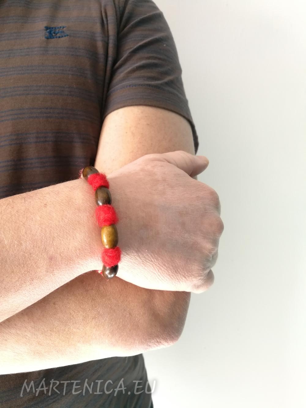 Материали: вълна, дърво Традиционната българска мартеница се изработва от вълна и включва различни елементи-символи:дървени мъниста(против уроки), паричка(за благополучие)